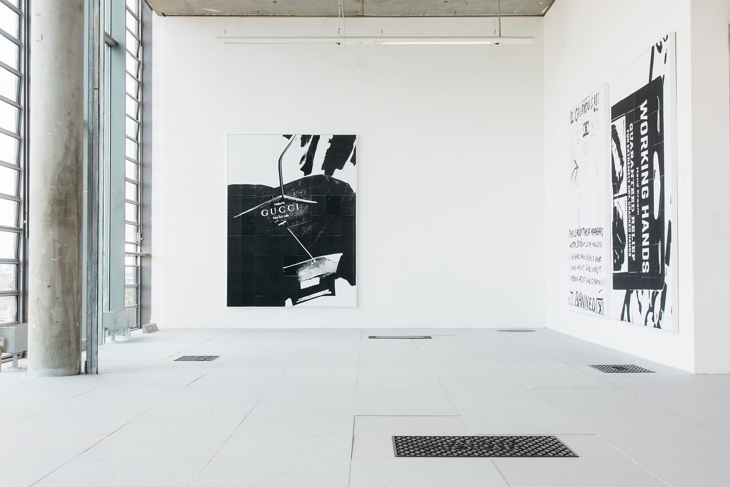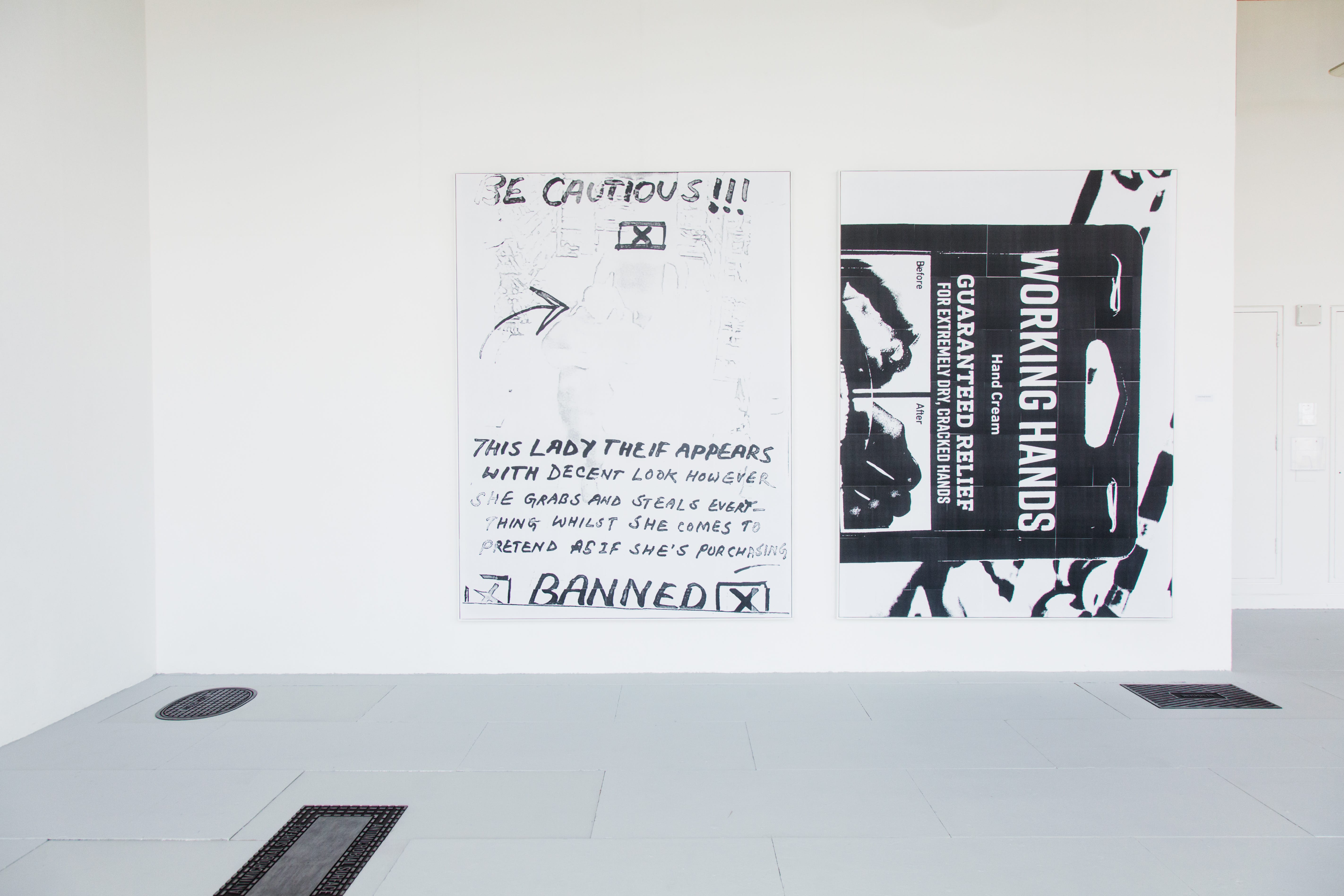First up, Carmen Huízar’s works in text are stunning! She reimagines the typography of drainage signs, conjuring an illusion of texture with just monochromatic paint on MDF. Paired with large wall pieces, her presentation encapsulates how she is reimagining found images to create something new.