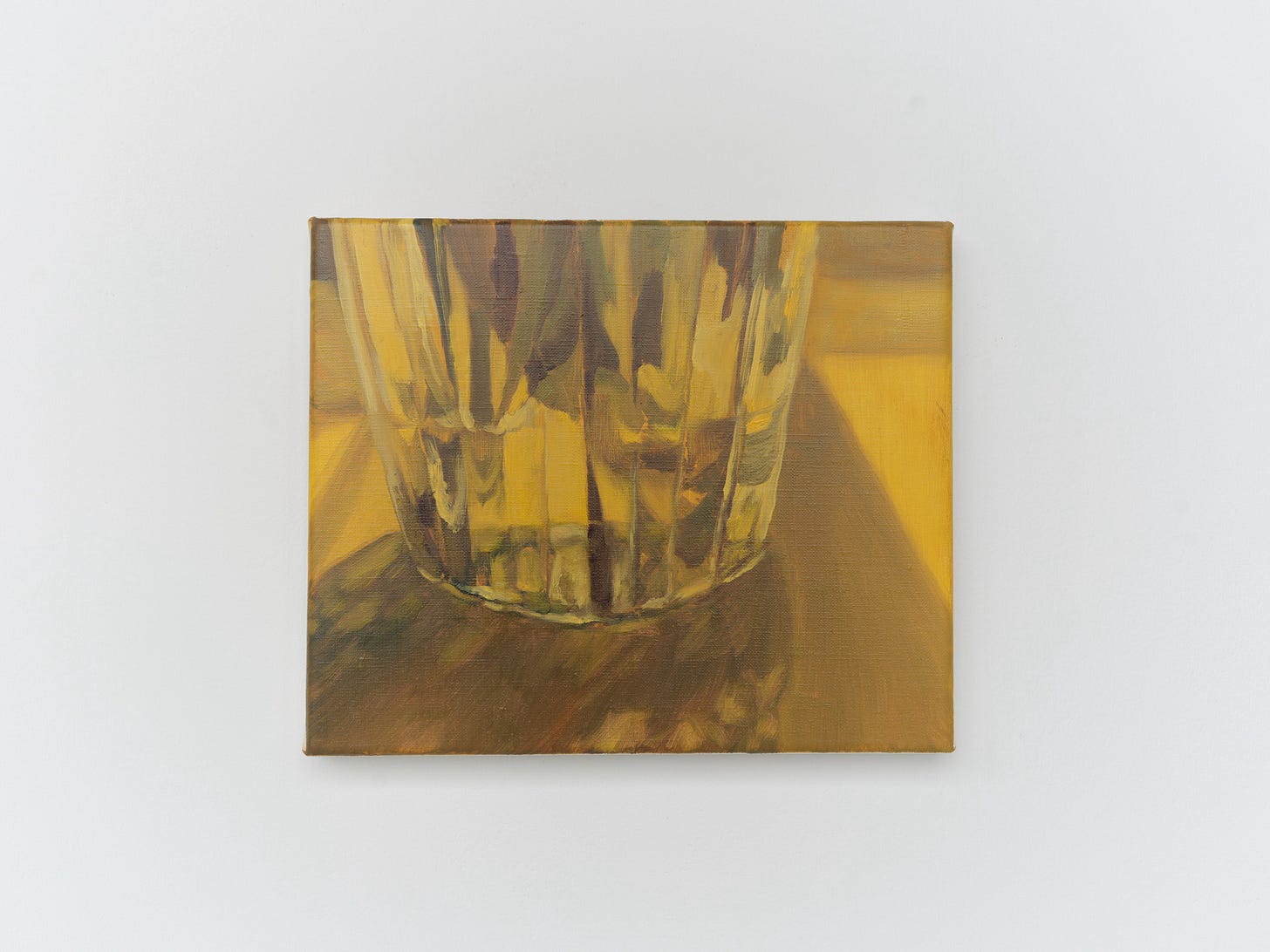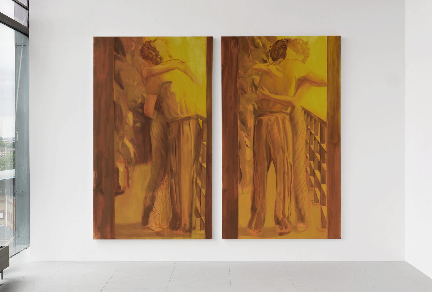 Ishbel Lowther’s life-size hugging figures, depicted in beautiful muted ochres, similarly evoke memory. Nearby, a small still life of a water glass feels quiet and restrained but just as magnetic.